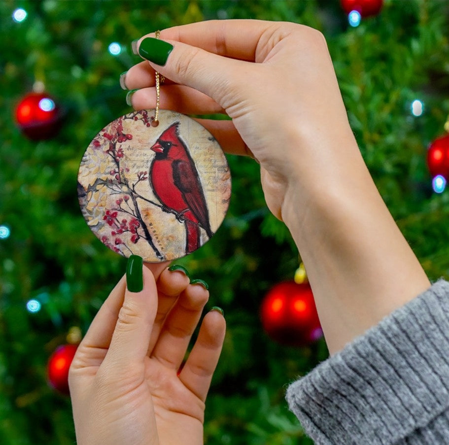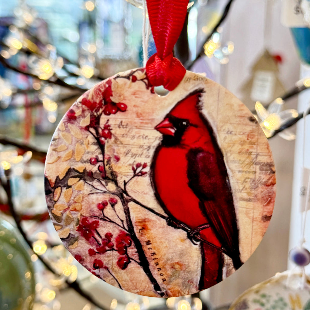 Created from my artwork titled "Always with You". This ceramic ornament is approx. 3 inches round and displays the same image on both sides. Includes a ribbon or string to hang it with (this may vary)